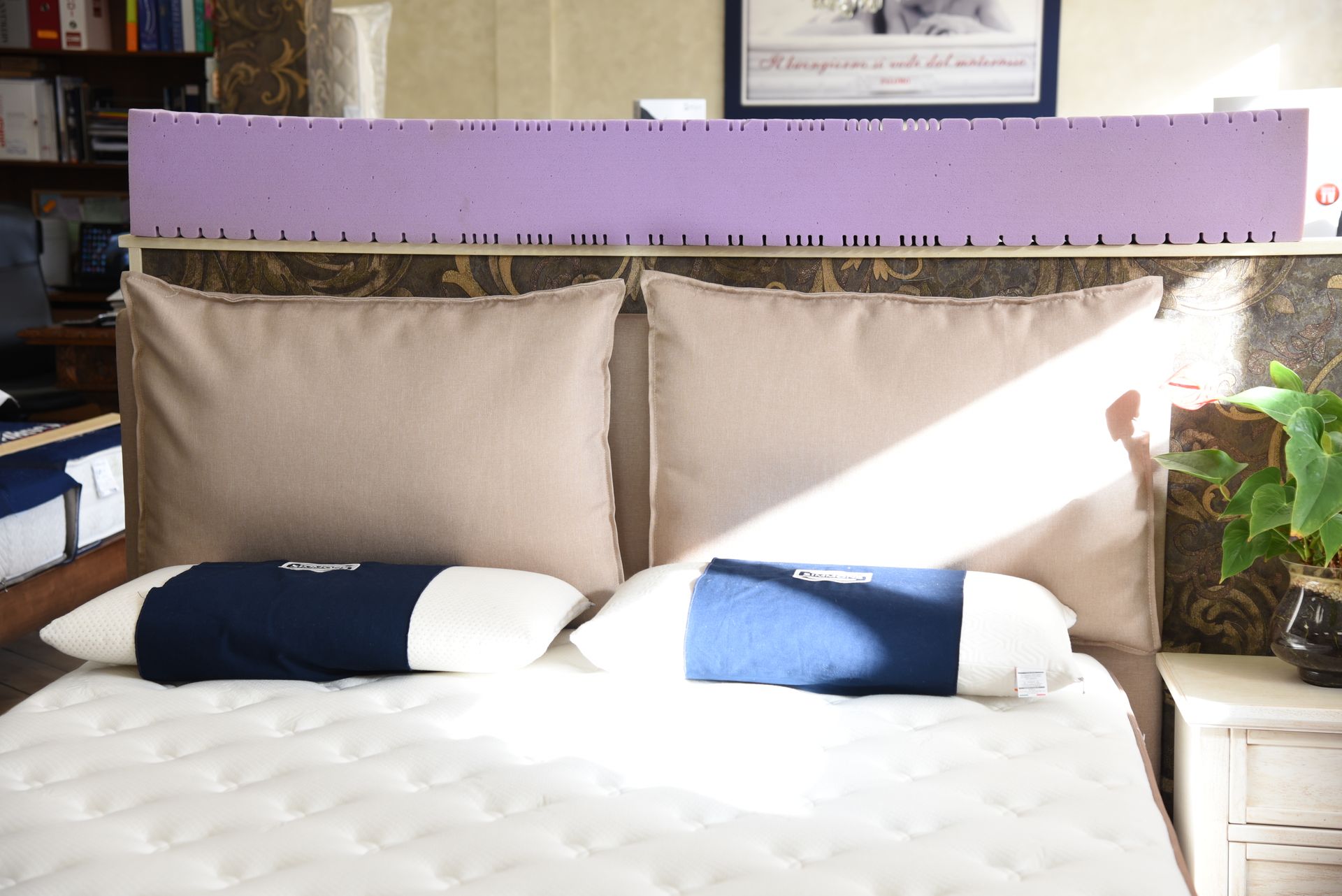 Sagoma tradizionale con nucleo in lattice forato per favorire la ventilazione e disperdere calore e umidità. Sostegno morbido al primo contatto, con resistenza progressiva alla pressione.